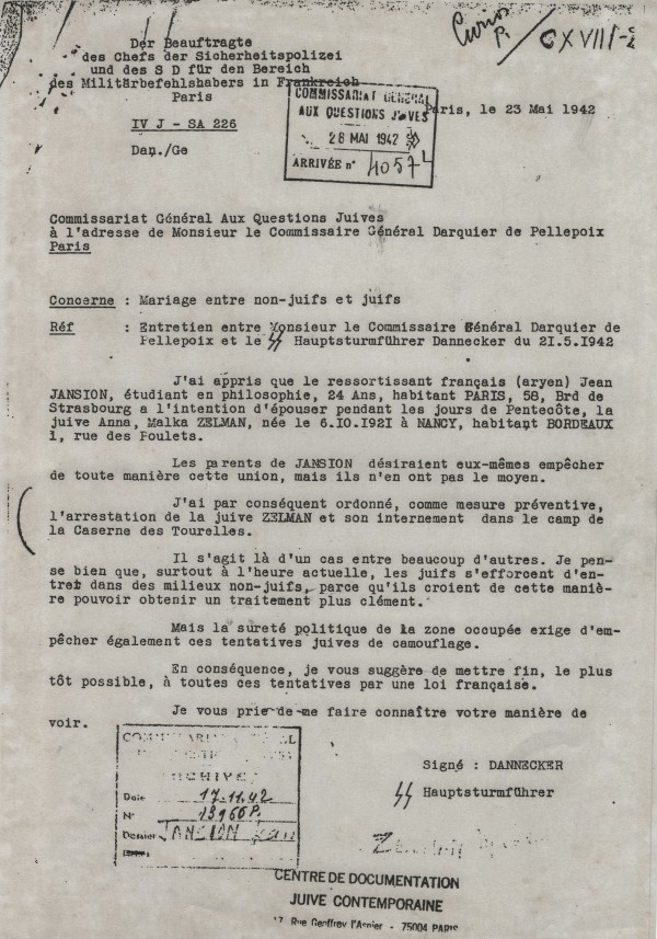 Le 22 mai 1942, celle-ci est arrêtée par la police française sur ordre de Theodor Dannecker, chef de la Gestapo et de la question juive,