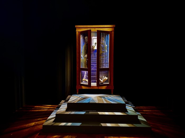 Ce meuble réunit ses matériaux de prédilection où ses interventions sur les photos anonymes d’un album de famille exhumé dialoguent avec des paysages forestiers. Au sommet d’un escalier, une pie, perchée en « gardienne des secrets », semble détenir la clef de récits muets énigmatiques articulés sur les facettes mobiles de la cage lumineuse de cette cosmogonie.